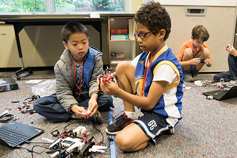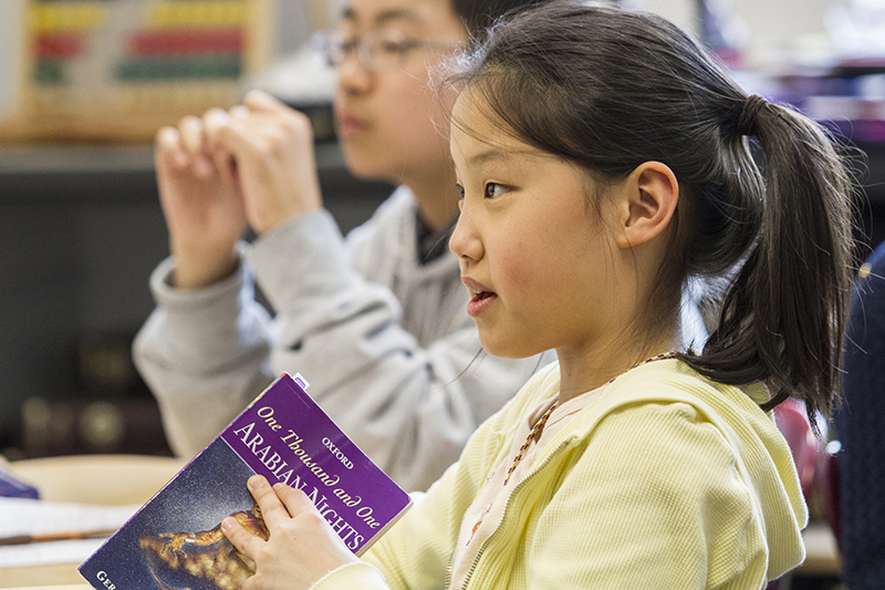 A line of student backpackers during an outdoor trip in a mountainous area.
