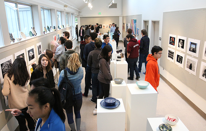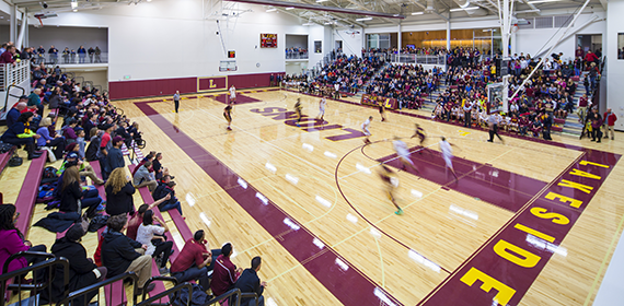 The Lakeside girls volleyball team playing a game with supporters in the bleachers.